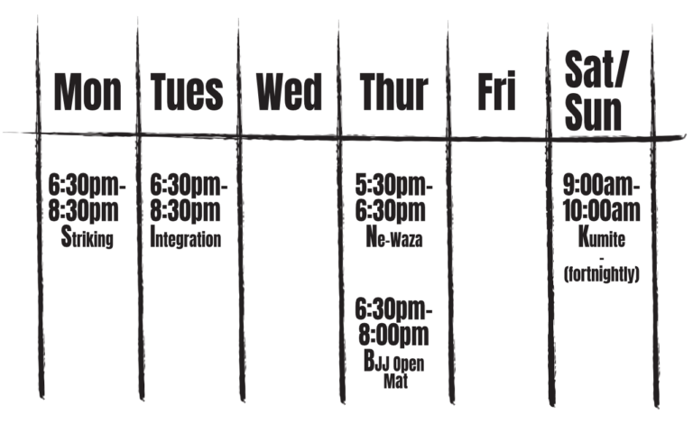 Thursdays primarily focus on developing student’s ‘ground-game’, focussing on control and movement, applying and defending submissions and striking.
